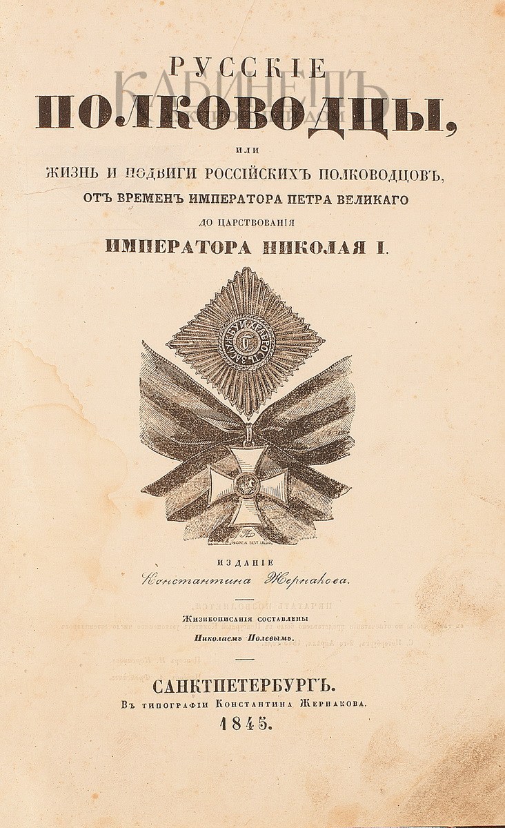Полевой Н.А. Русские полководцы, или жизнь и подвиги российских полководцев, от времен Императора Петра Великого до царствования Императора Николая I. Жизнеописания составлены Николаем Полевым. СПб., Издание Константина Жернакова, 1845.