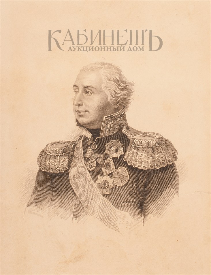 Гравированный заглавный лист с украшением, 12 гравированных на стали портретов: императора Петра Великого, Б.П. Шереметева, А.Д. Меншикова, Б.Х. Миниха, П.А. Румянцева, Г.А. Потёмкина, А.В. Суворова, М.И. Кутузова, М.Б. Барклая-де-Толли, П.Х. Витгенштейна, И.И. Дибича, И.Ф. Паскевича.
