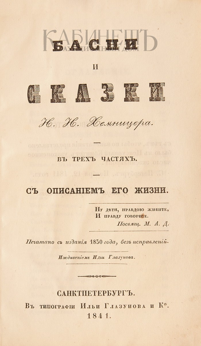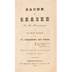 [Хемницер И.И.] Басни и сказки И.И. Хемницера. В трех частях. С описанием его жизни. Печатано с издания 1830 года, бес исправлений. Иждивением И. Глазунова и Ко. СПб., в типографии И. Глазунова, 1841.