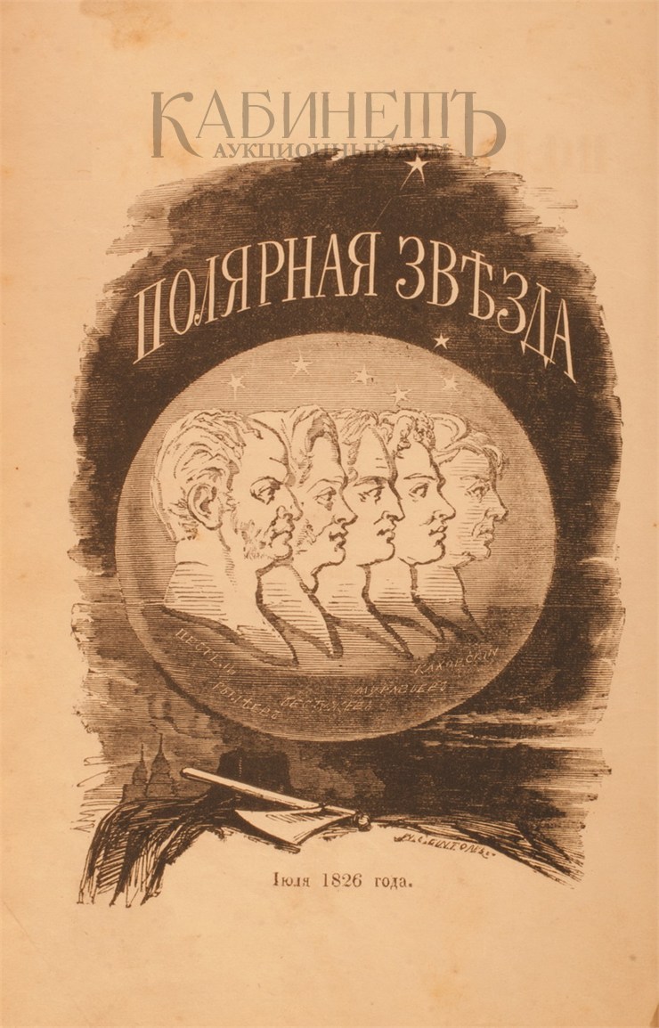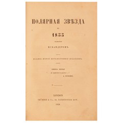 «Полярная звезда» – литературный и общественно-политический альманах, издававшийся А. И. Герценом и Н. П. Огарёвым в Вольной русской типографии в 1855-1868 гг. Герцен предложил бесцензурную трибуну всем, чьи мысли не могли быть опубликованы в России. По просьбе Герцена для обложки и титульного листа нового издания английский рабочий-гравер и литератор, участник движения чартистов Вильям Линтон создал изображение профилей пяти казненных декабристов — К.Ф. Рылеева, М.Л. Бестужева-Рюмина, С.К. Муравьева-Апостола, П.И. Пестеля и П.Г. Каховского.