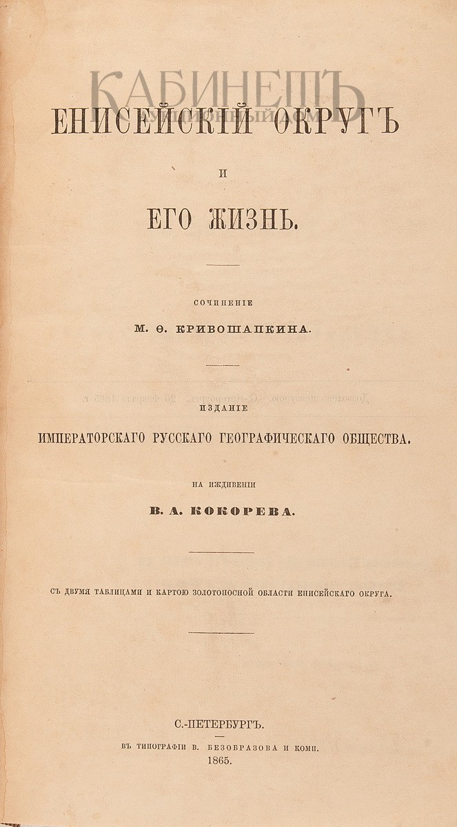 Кривошапкин М.Ф. Енисейский округ и его жизнь. Издание Императорского Русского географического общества. На иждивении В.А. Кокорева. С двумя таблицами и картою золотоносной области округа. В 2-х томах в одной книге. СПб., в типографии В. Березина и Ко, 1865.