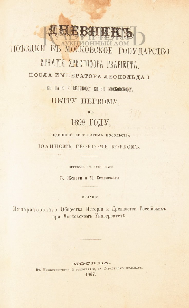 Корб Иоанн Георг(1670 – 1741) – немецкий государственный деятель. После окончания Вюрцбургского университета был зачислен в звании секретаря в штат посольства Игнатия Христофора де Гвариента и отправлен Римским императором Леопольдом I в Московское государство к царю Петру Алексеевичу. Основной целью поездки являлось укрепление дипломатических отношений между странами, незадолго до этого заключивших общеевропейский союз – Австрии, Речи Посполитой, Венецианской Республики и России, направленный против Турции и Крымского ханства. Пребывание Корба в Московии (с 3 апреля 1698г. по 28 июля 1699г.) совпало со временем возвращения из первого заграничного путешествия царя Петра Алексеевича, первых решительных шагов на пути преобразования внутренней жизни русского народа. Иоанн Георг Корб был первым из иностранных авторов, кто описал Россию при Петре I, а его дневники, являются образцом путевых заметок, изображающих визиты иностранных посольств в Россию.