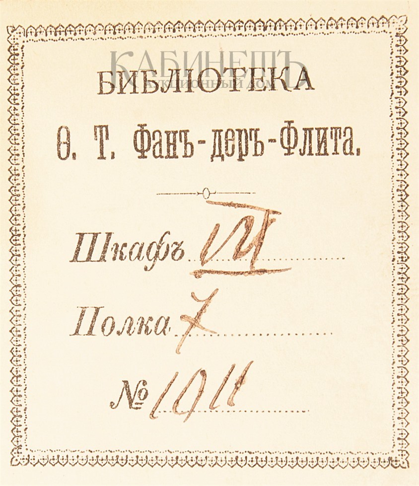 Экземпляры в старинных полукожаных переплетах с золотым тиснением по корешкам, на форзацах расположен экслибрис «Библиотека Ф.Т. Фон-дер-Флита», на титульном листе и некоторых страницах встречается нечитаемый штамп, под переплетом сохранены издательские обложки. У тома VIII раскол по корешку в нижней части.