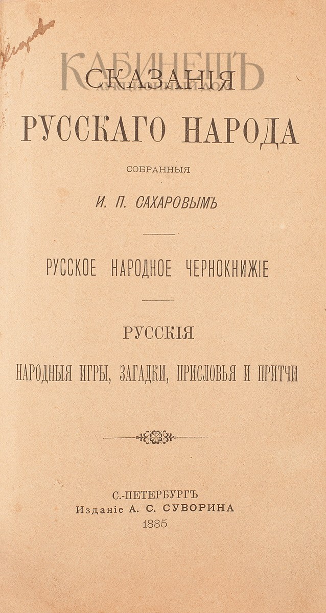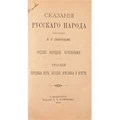 Сказания русского народа, собранные И.П. Сахаровым. В 2-х частях (в одной книге). Ч. I: Русское народное чернокнижие. Русские народные игры, загадки, присловья и притчи. Ч. II: Народный дневник. Праздники и обычаи. СПб., изд. А.С. Суворина, 1885.