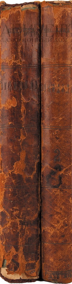 Экземпляр в полукожаных старинных переплетах, утраты внизу и вверху корешков, кожа рассохлась.