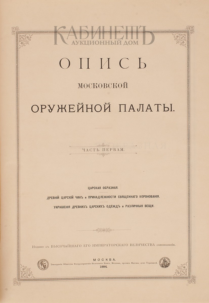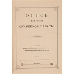 Описано 9736 единиц хранения Оружейной Палаты на 1893 г. Уникальное справочное издание для работы с предметами декоративно-прикладного искусства. Опись содержит много сведений о ювелирных изделиях, изделиях декоративно-прикладного искусства, клеймах мастеров, холодном и огнестрельном оружии, украшениях древних Царских одежд, принадлежностях священного коронования, конюшенной казне, броне, древней домашней утвари, мебели и одежде, золотой и серебряной посуде, знаменах, флагах, штандартах и многих других уникальных предметах.