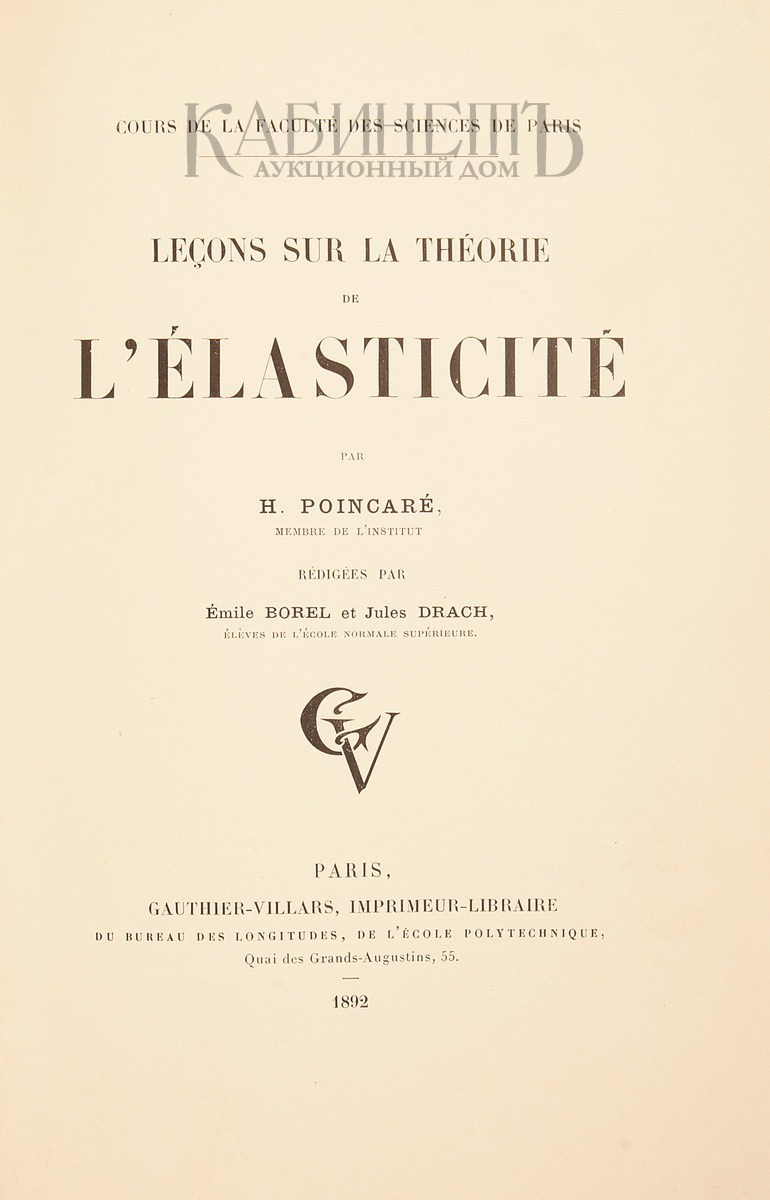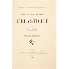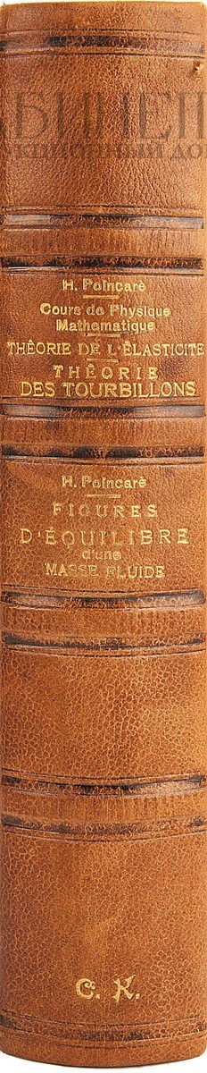 Архив аукциона №10(43) Лот 142 Poincare H. Leçons sur la théorie l’élasticité, Théorie des tourbillions. Leçons professée pendant le deuxième semester 1891–92, Figures d’équilibre d’une masse fluide. Leçons professée à la Sorbonne en 1900. Cours de la Faculté des Sciences de Paris. Paris, Gauthier-Villars, imprimeur-libraire, 1892–1902.