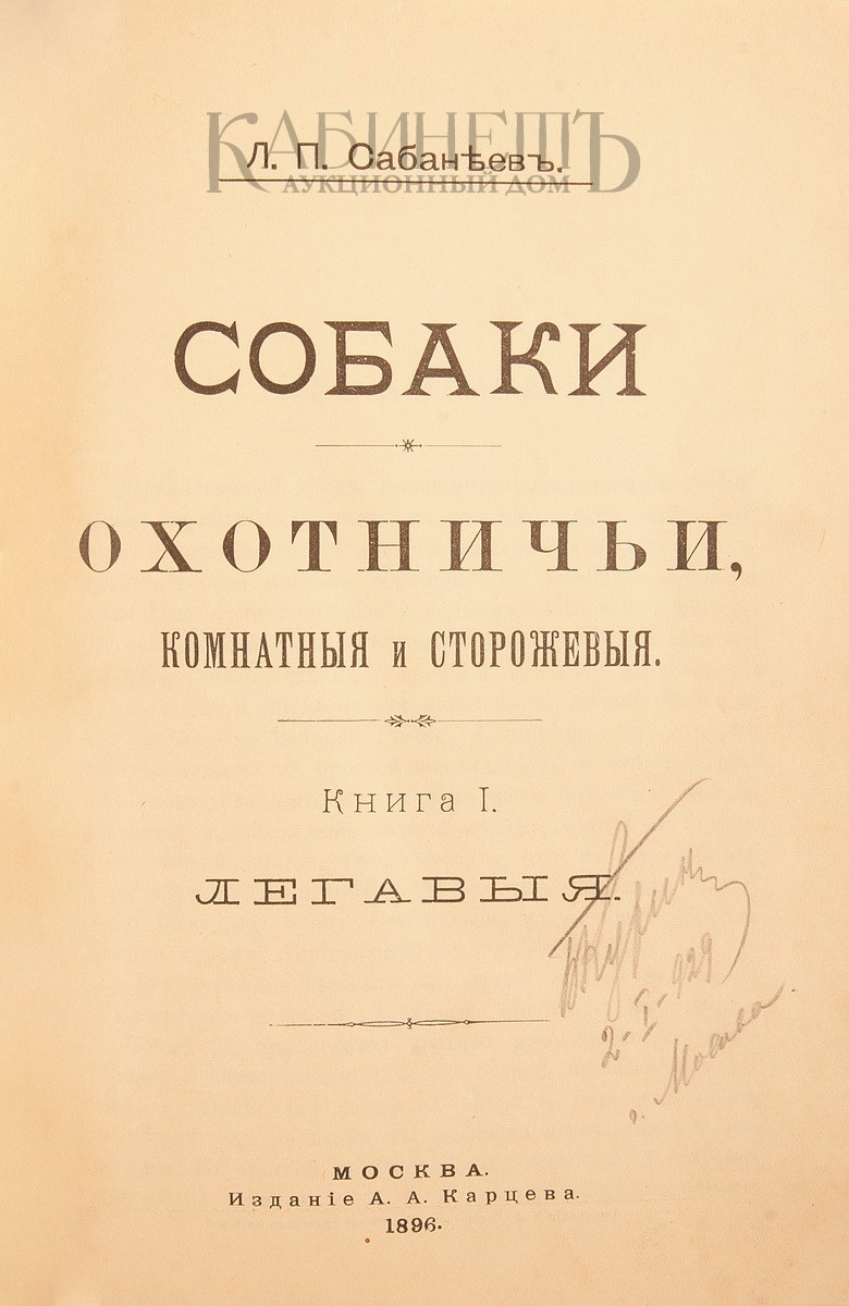 Сабанеев Л.П. Собаки охотничьи, комнатные и сторожевые. Книга I (единственная) Легавые. М., издание А. А. Карцева, 1896.