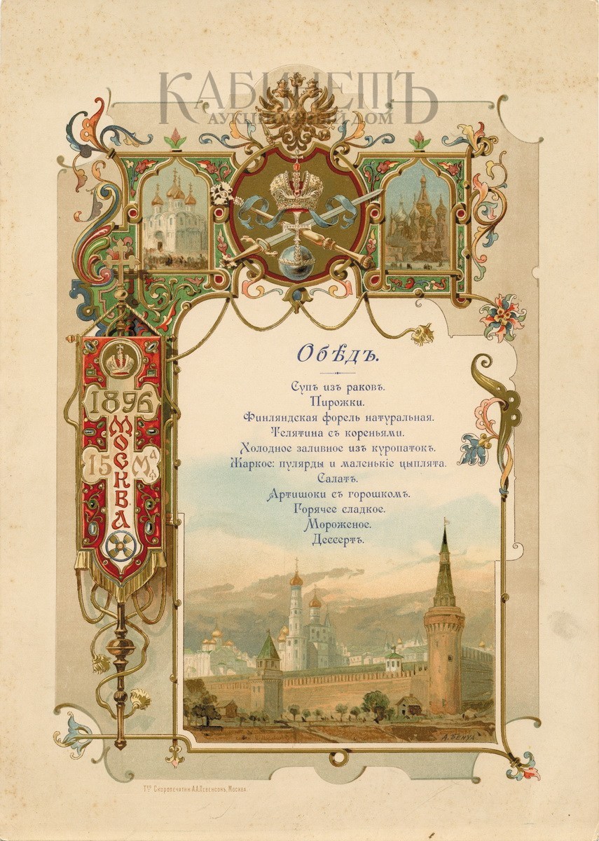 Бенуа А. Н. Меню торжественного обеда 15 мая 1896 г., данного духовенству и особам первых двух классов в Грановитой палате по случаю коронации императора Николая II и императрицы Александры Федоровны М., Скоропечатня А.А. Левинсона.