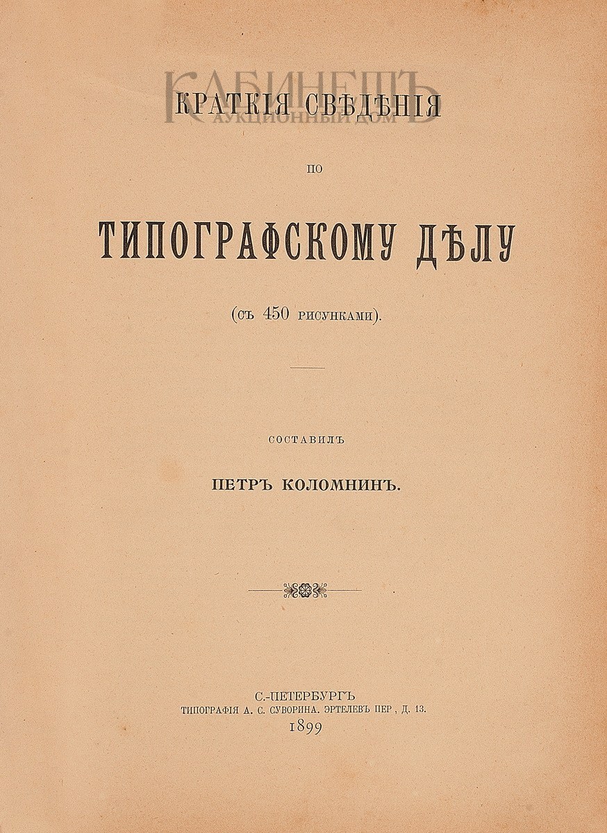 Коломнин Петр. Краткие сведения по типографскому делу. СПб., изд.А.С. Суворина, 1899.