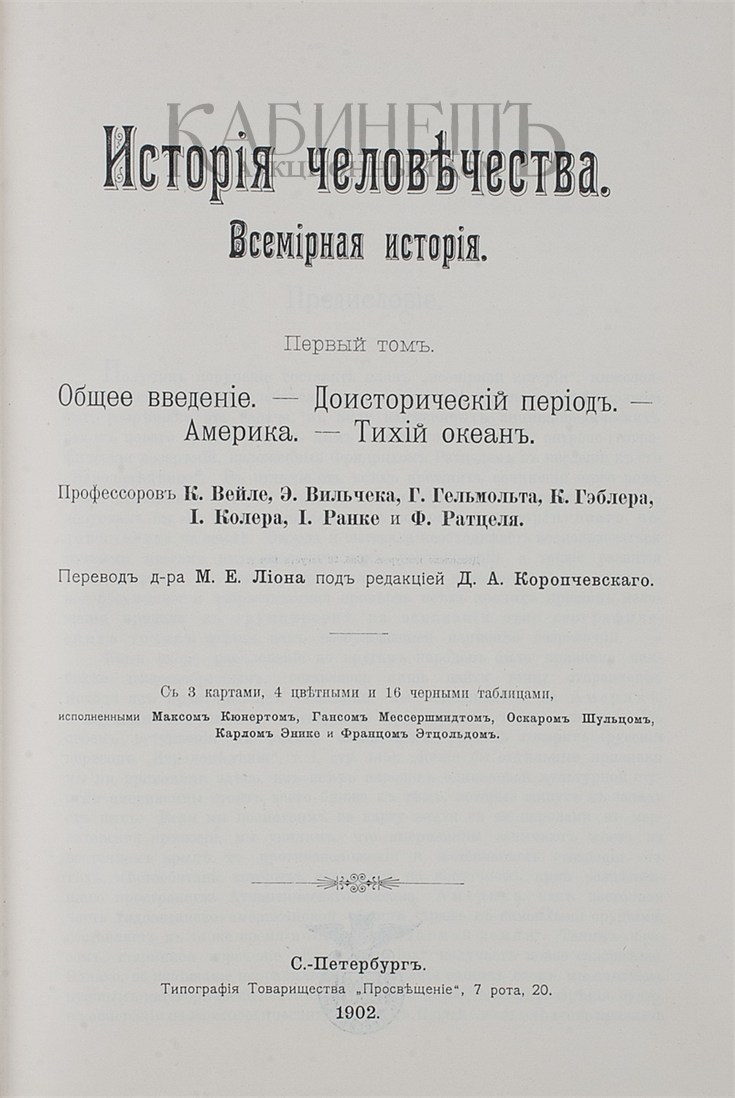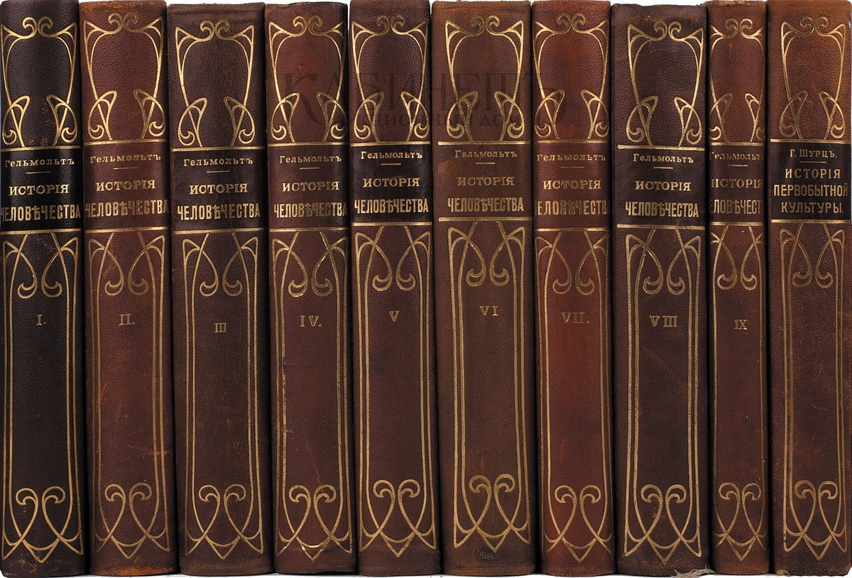 2) Гельмольт Г. Всеобщая история человечества. С 220 отдельными приложениями, из них 50 хромолитографий, 40 карт в красках и 130 черных катин. В 9 томах. СПб., Типография Товарищества «Просвещение», 1902.