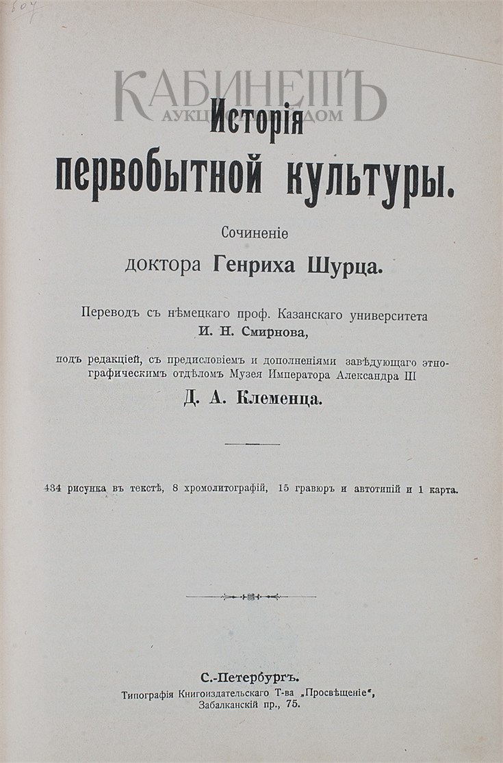 1) Шурц Г. История первобытной культуры. Перевод с немецкого профессора Казанского университета И.Н. Смирнова. 434 рисунка в тексте, 8 хромолитографий, 15 гравюр и автотипий и 1 карта. СПб., Типография Книгоиздательства Товарищества «Просвещение», [б.г.]