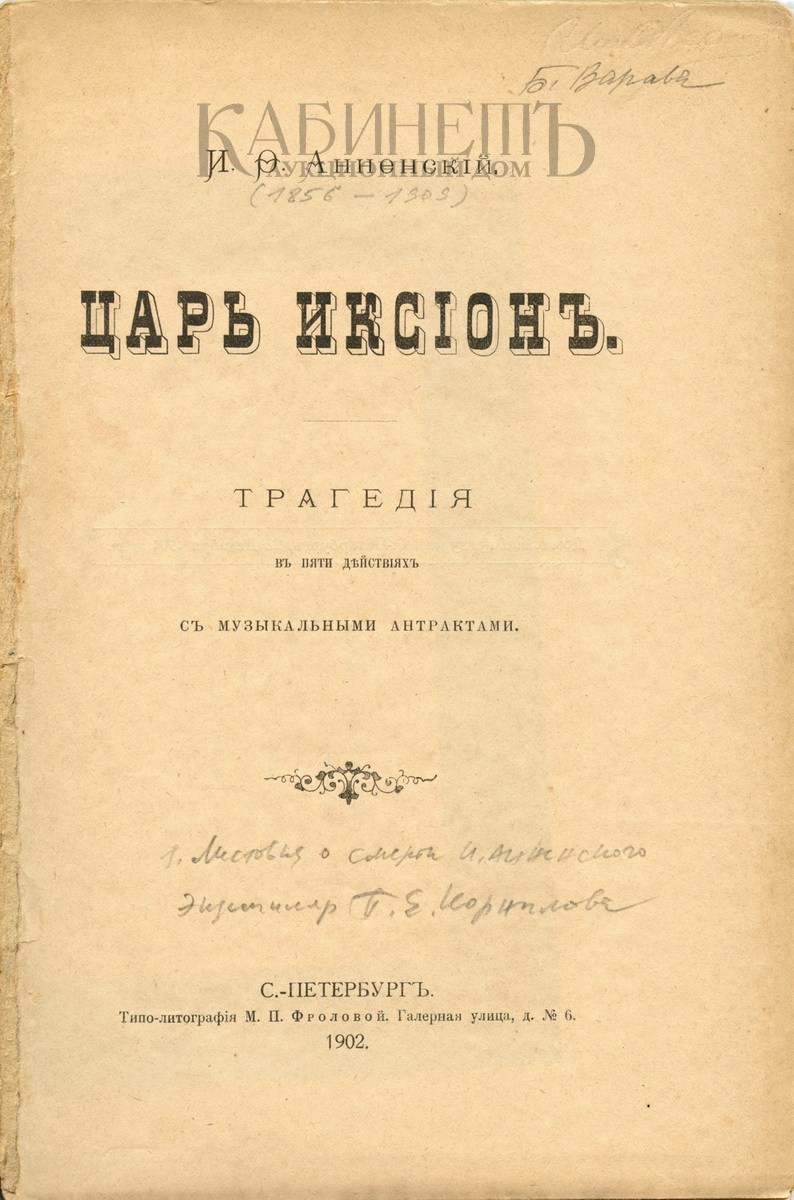 Экземпляр в издательской бумажной обложке. Хорошая сохранность. Листовка, выпущенная в день смерти Анненского И.Ф.