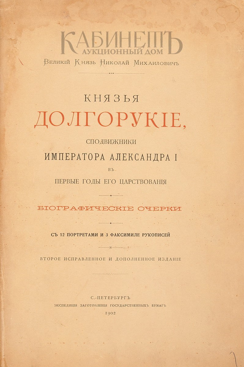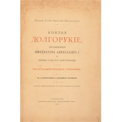 Великий князь Николай Михайлович. Князья Долгорукие, сподвижники Императора Александра I в первые годы его царствования. Биографические очерки. С 12 портретами и 3 факсимиле рукописей. Второе исправленное и дополненное издание. СПб., Экспедиция заготовления государственных бумаг, 1902.