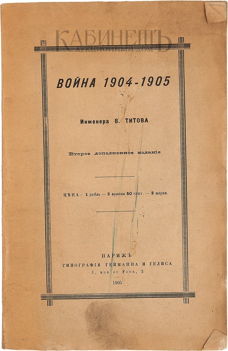 Титов В. Война 1904 – 1905. Второе дополненное издание. Париж, типография Гейманна и Глиса, 1905.