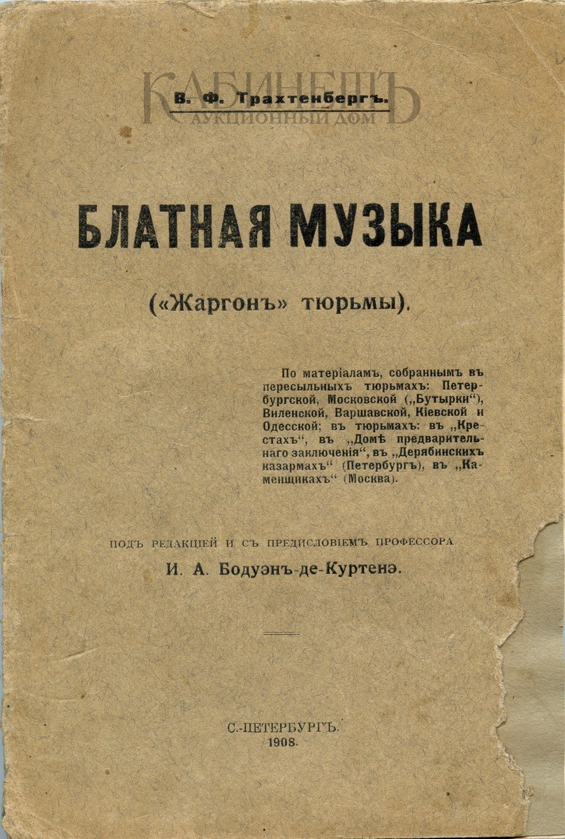 Трахтенберг В.Ф. Блатная музыка. («Жаргон» тюрьмы). Под редакцией и с предисловием профессора И.А. Бодуэн-де-Куртенэ. СПб., типография А.Г. Розена,1908.