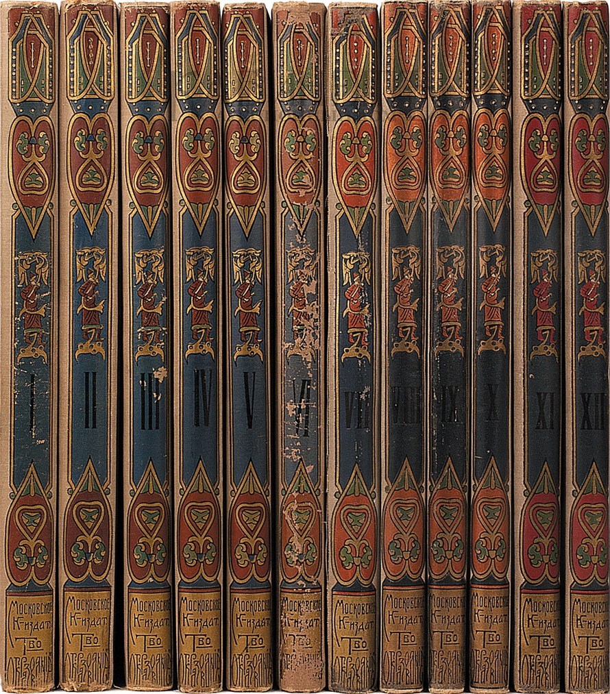 3) В 12 выпусках в издательских художественных коленкоровых переплетах в стиле модерн работы художника П. Афанасьева.