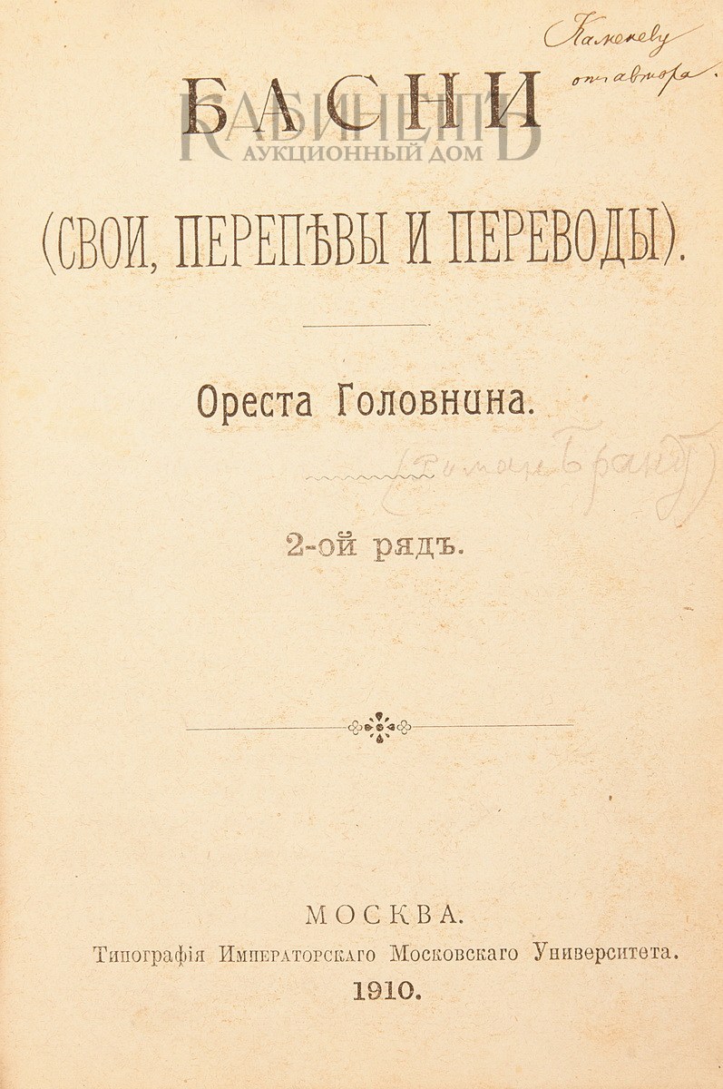 Брандт Роман Фёдорович (1853 – 1920) – литературный псевдоним Орест Головин – писатель, поэт, переводчик. Опубликовал свыше ста работ по различным вопросам акцентологии, фонетики и сравнительной грамматики славянских языков, ряд статей посвящённых отдельным поэтам, несколько курсов лекций. Высказывался за упрощение русского правописания, в 1900–1910 гг. пропагандировал эсперанто, в частности, основал в Москве Общество эсперантистов. Владел 20 языками, на многих из них свободно слагал стихи.