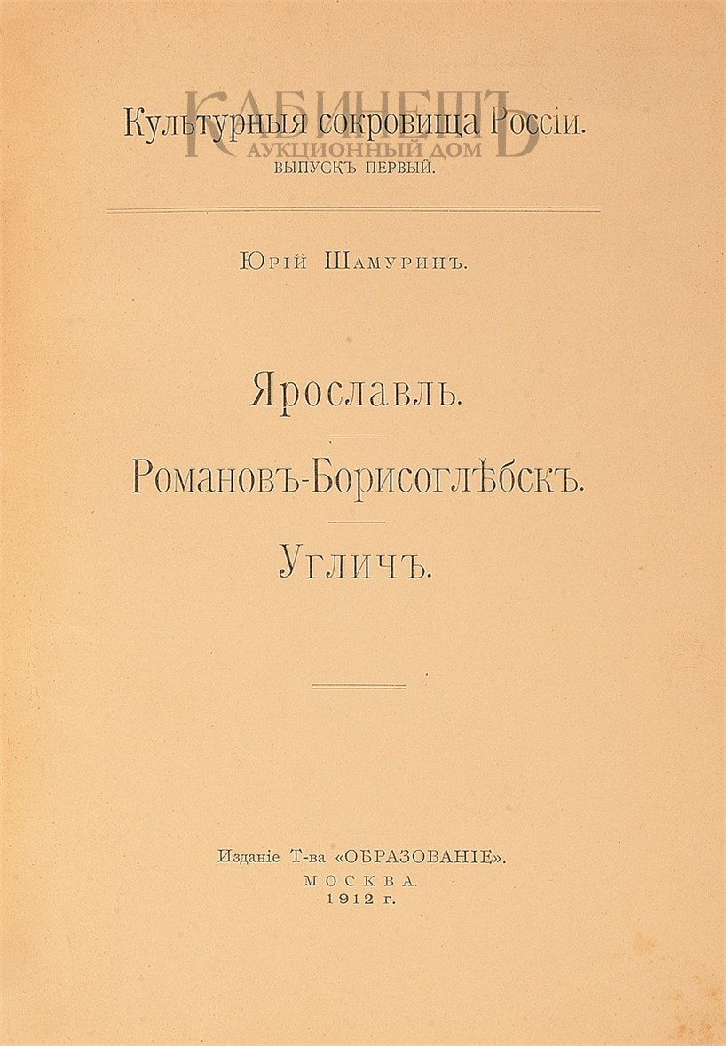 Шамурин Ю. Ярославль. Романов-Борисоглебск. Углич. Серия «Культурные сокровища России» Выпуск I. М., издательство «Образование», 1912.