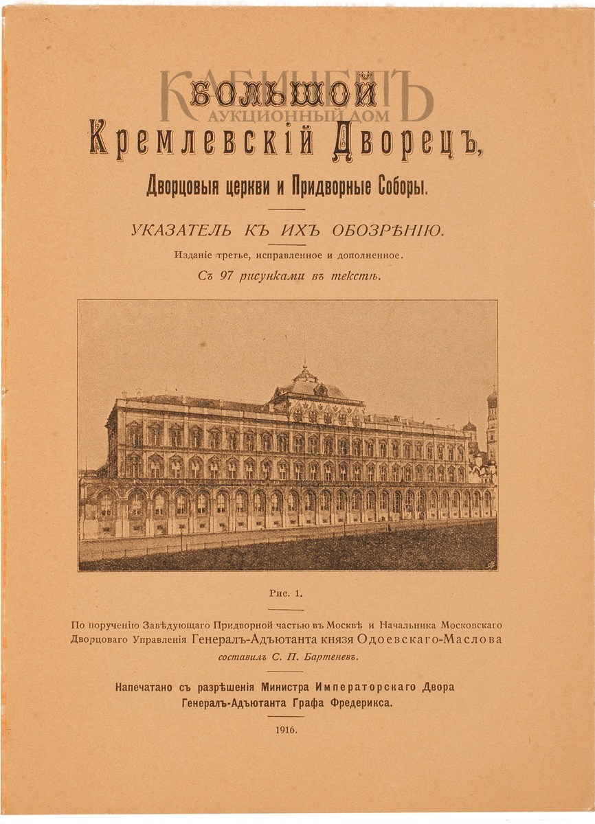 Большой Кремлевский Дворец, Дворцовые церкви и Придворные Соборы. Указатель к их обозрению. Издание третье, исправленное и дополненное. С 97 рисунками в тексте. М., Синодальная Типография, 1916.