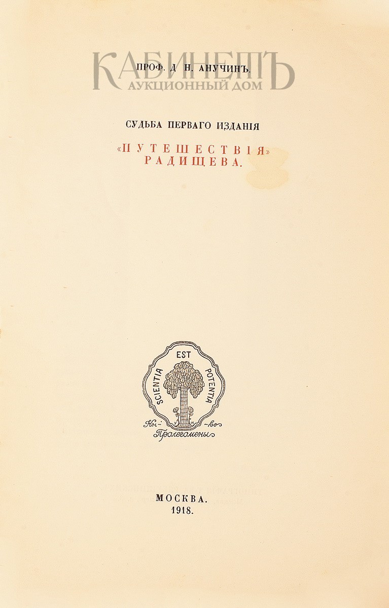 Анучин Д.Н. Судьба первого издания «Путешествия» Радищева. М., Книгоиздательство Пролегомены, 1918.