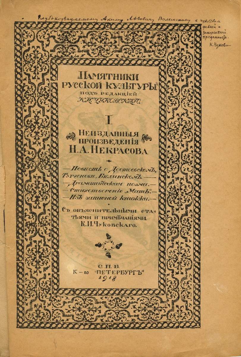 Экземпляр в бумажной издательской обложке. На титульном листе расположен автограф Корнея Ивановича Чуковского: «Глубокоуважаемому Акиму Львовичу Волынскому с чувством давней и закоренелой преданности. К.Чуковский». Состояние очень хорошее. Блок не обрезан. Обложка имеет мелкие надрывы, утраты по краям. Корешок наполовину утрачен.