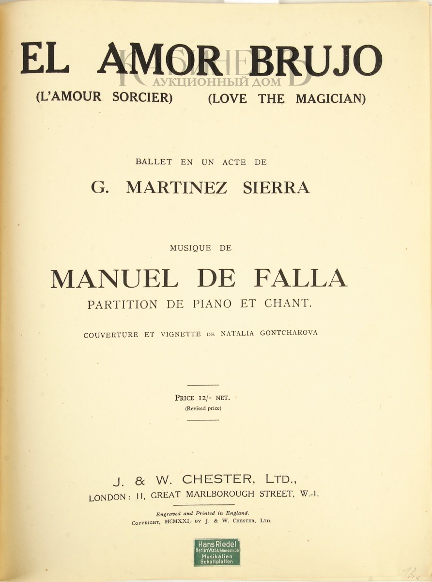 Клавир. Мануэль де Фалья. Балет в одном акте «Любовь-колдунья». Лондон, Дж. и В. Честер, 1921.