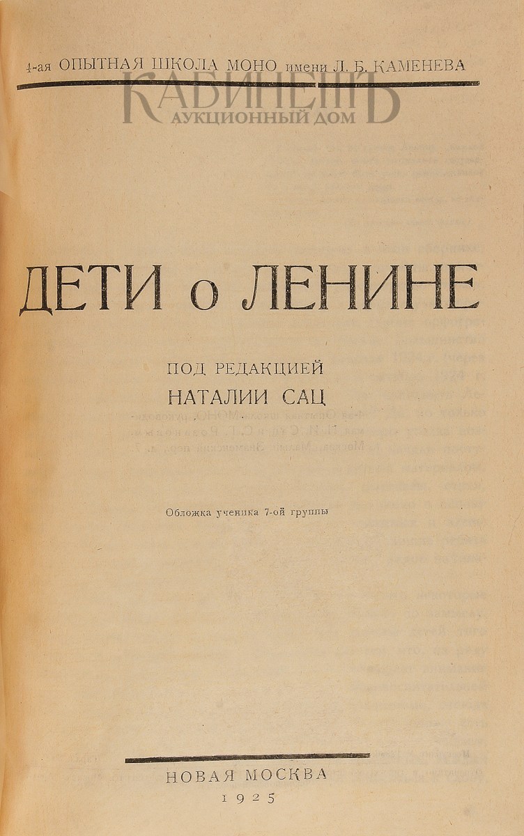 Сац Н. Дети о Ленине. 4-я Опытная Школа Моно имени Л.Б. Каменева. Обложка ученика 7-й группы. М., Новая Москва, 1925.