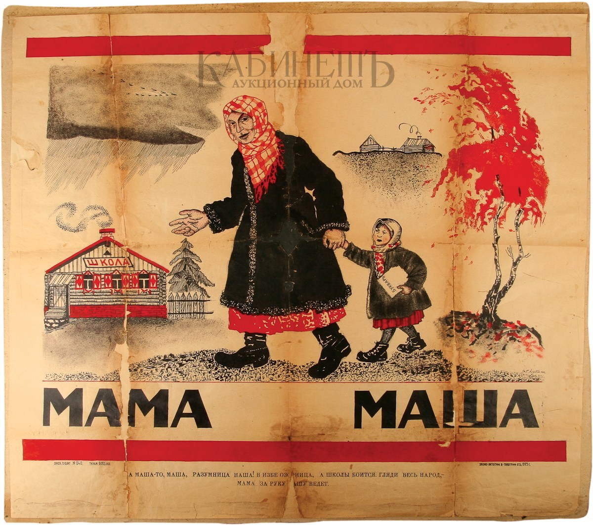 «Мама-Маша. А Маша- то, Маша, разумница наша! В избе озорница, а школы боится. Гляди, весь народ, - мама за руку Машу ведет». Омск, ГУБЛИТ, 1925.
