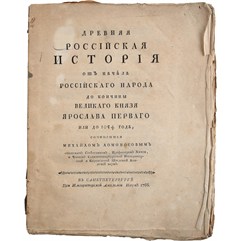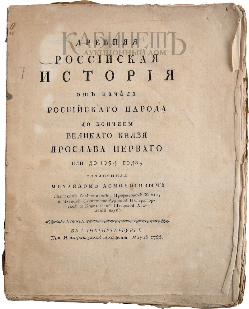 Этот исторический труд Ломоносова положил начало сочинениям о русской истории. Книга Ломоносова как историческое исследование стала первой в России; до неё известны были только летописи и синопсисы; она издана на следующий год после смерти великого учёного. К сожалению, труд не был закончен, преждевременная кончина в 1765 году Ломоносова прервала работу. Подготовленные материалы для других томов были конфискованы по приказу Екатерины II и в дальнейшем пропали. Ломоносов намеревался дать в первом томе ещё две части, после его смерти, по решению Конференции Академии наук, Август Шлёцер написал краткое предисловие «К читателю». Последняя страница, имевшая указание «Конец второй части» была перепечатана. В изменённом варианте на последней странице – слово «Конец». В предлагаемом нами издании последняя страница не менялась и имеет указание – «Конец второй части». Данные экземпляры особенно ценны, так как в продажу поступили издания только с переделанной 140-ой страницей со словом «Конец».