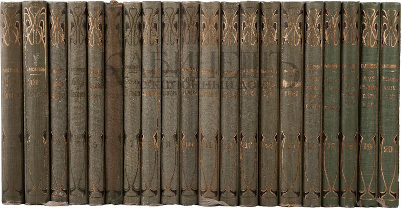 Экземпляр в издательских коленкоровых переплетах в стиле модерн, с золотым тиснением по корешкам и верхним крышкам. На форзацах расположен экслибрис: «Из книг А.В. Леонтьева-Истомина». На нескольких томах расположен штамповый экслибрис: «А. Вахитов».
