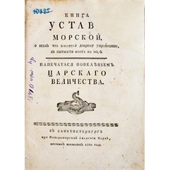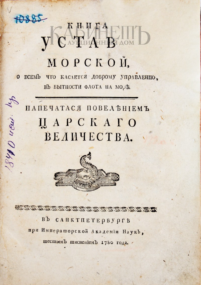 Книга устав морской, о всем что касается доброму управлению в бытности флота на море. Напечатана повелением Царского Величества. СПб., при Императорской Академии Наук, 1780.