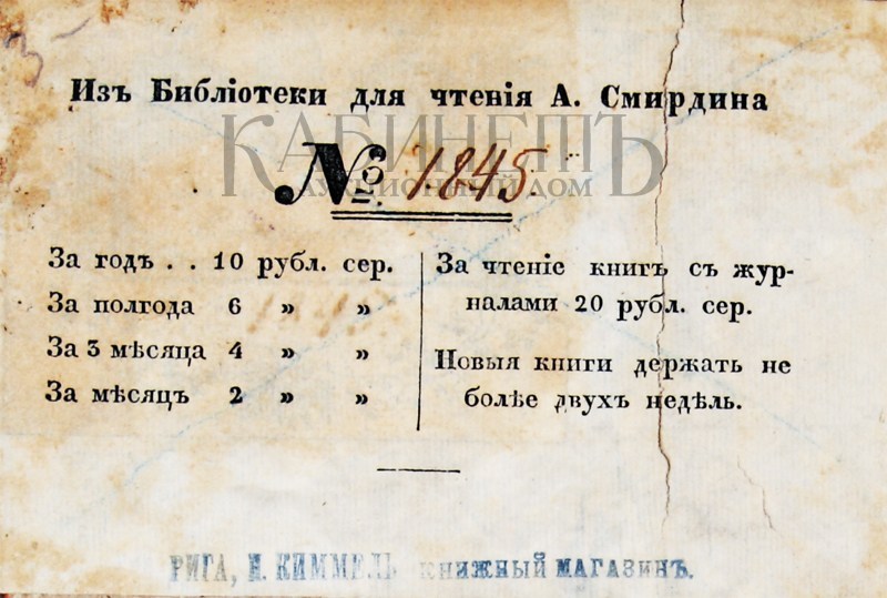 Экземпляр в старинном цельнокожаном переплете с золотым тиснением по корешку. На форзаце расположен экслибрис: «Из библиотеки для чтения А. Смирдина. Рига, Н. Киммель книжный магазин», на титульном листе пометки синими чернилами.