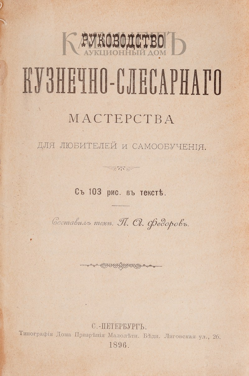 Федоров П.А. Руководство Кузнечно-слесарного мастерства для любителей и самообучения. СПб., Типография Дома Призрения Малолетн. Бедн., 1896.