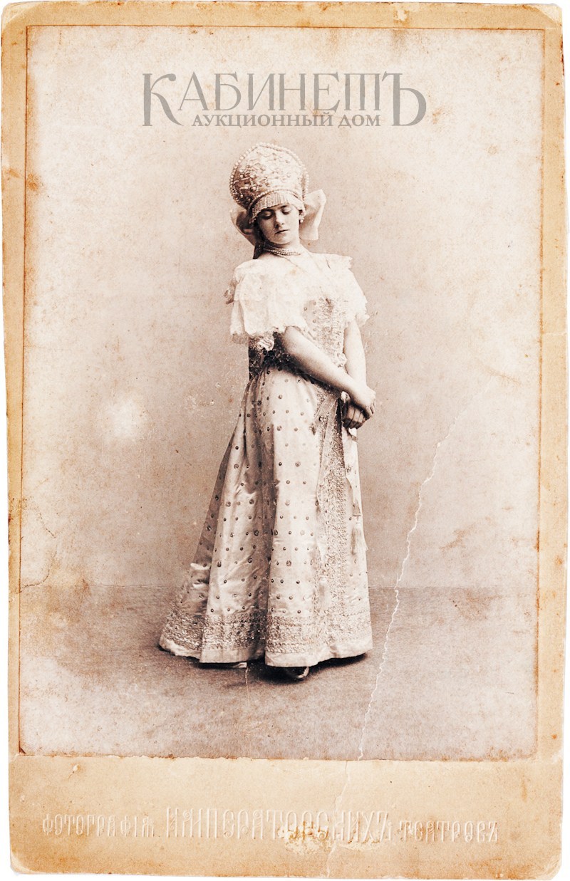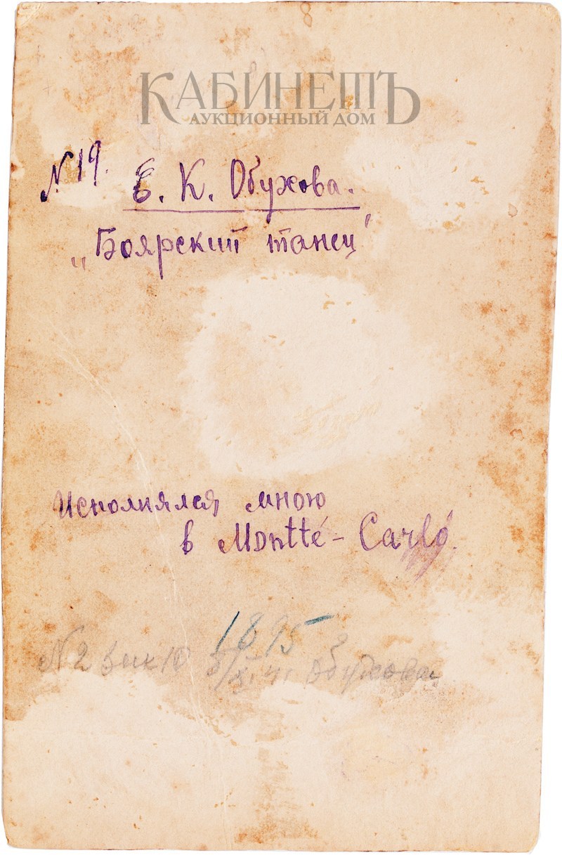 Фотография на плотном фирменном паспарту, на обратной стороне автограф Е.К. Обуховой: «№ 19. Е.К. Обухова. «Боярский танец». Исполнялся мною в Monte-Carlo». Ниже находятся владельческие пометки зеленым карандашом.