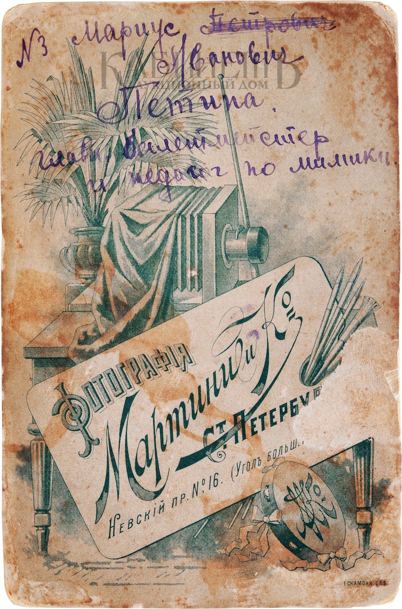 Фотография на плотном фирменном паспарту. В нижней части паспарту расположен автограф М. Петипа: для Е.К. Обуховой: «Souvenir a l’artiste de talent et consciencieux Madame Oboukova. M. Petipa. 8 Dic, 96. S. Pitersbourg». На обратной стороне автограф Е.К. Обуховой: «№3. Мариус Иванович Петипа глава балетмейстер и педагог по мимике».