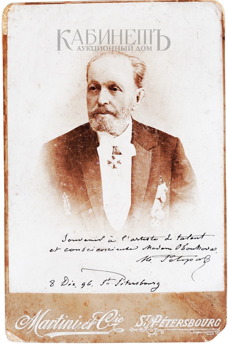Автограф Мариуса Петипа на его фотографии, подписанный балерине Е.К. Обуховой. На обратной стороне фотографии автограф Евгении Константиновны Обуховой. СПб., Фотография Мартини и Kо, 1896.