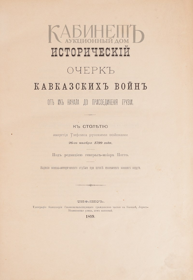 Потто А.В.. Исторический очерк кавказских войн от их начала до присоединения Грузии. К столетию занятия Тифлиса русскими войсками 26 ноября 1799 года. Тифлис, Издание военно-исторического отдела при штабе кавказского военного округа, 1899.