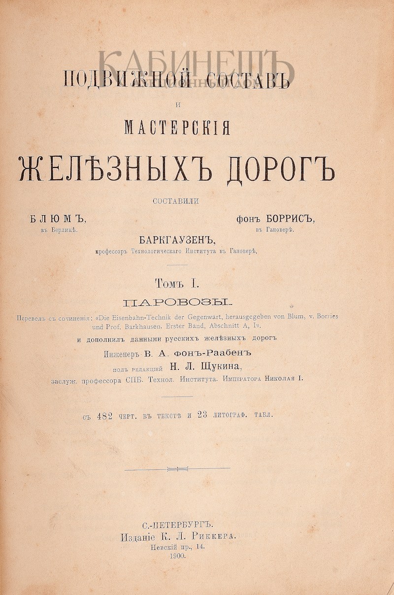 Фон Раабен В.А., Блюм, Баркгаузен, Боррис. Подвижной состав и мастерские железных дорог. Том I: Паровозы / под ред. Н.Л. Щукина. С 482 черт. в тексте и 23 литограф. табл. СПб., Издание К.Л. Риккера, 1900.