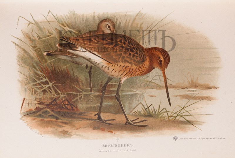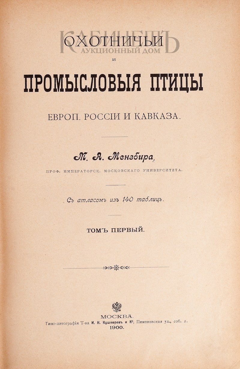 Мензбир М.А. Охотничьи и промысловые птицы Европейской России и Кавказа. В 3-х тт. С атласом из 140 таблиц. М., Типолитография Товарищества «И.Н. Кушнерев и Ко», 1900.