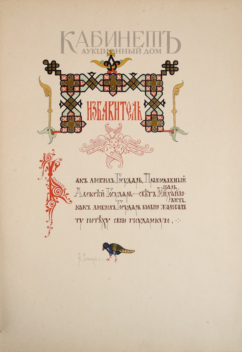 Одно из замечательных, редко встречающихся изданий, оформленных великолепными рисунками, заставками и инициалами с киноварью и золотом Николая Самокиша. Поэма вошла во 2-ой том «Царской охоты», а также была издана отдельно в 1900 году (данный экземпляр) в очень ограниченном количестве (предположительно около 100 экземпляров).