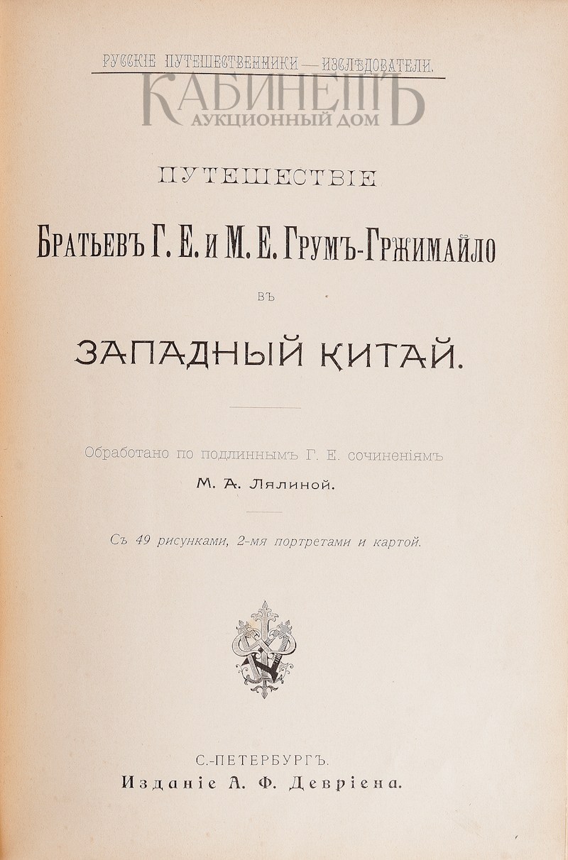 Путешествие братьев Г.Е. и М.Е. Грум-Гржимайло в Западный Китай. С 49 рисунками, 2-мя портретами и картой. В 2-х частях в одной книге. СПб., Изд. А.Ф. Девриена, 1901.