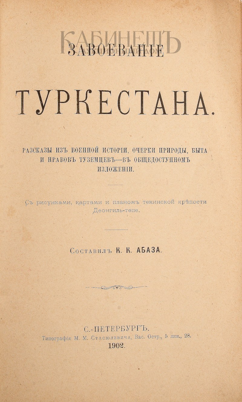 Абаза К.К. Завоевание Туркестана. Рассказы из военной истории, очерки природы, быта и нравов туземцев – в общедоступном изложении. СПб., Типография М.М. Стасюлевича, 1902.