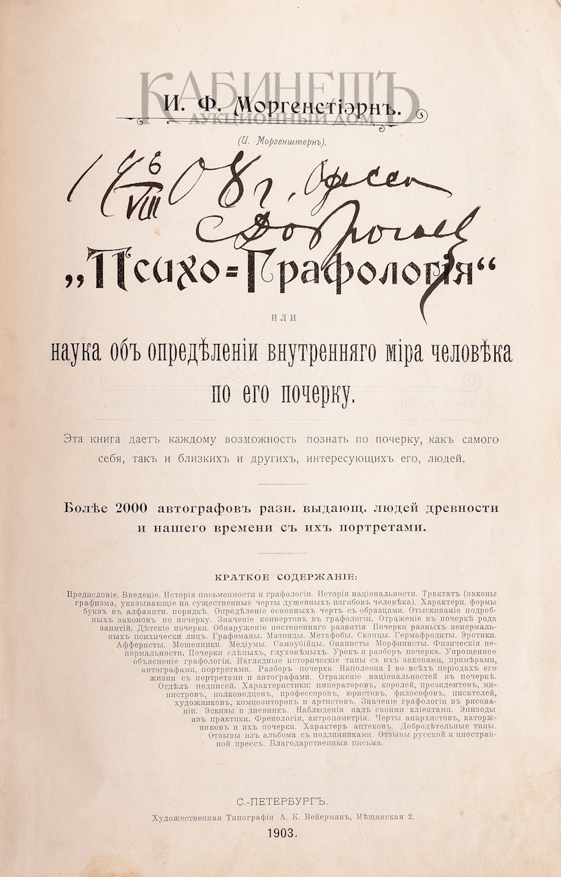 Моргенстэрн И.Ф. Психографология или наука об определении внутреннего мира человека по его почерку. СПб., Тип. А.К. Вейерман, 1903.