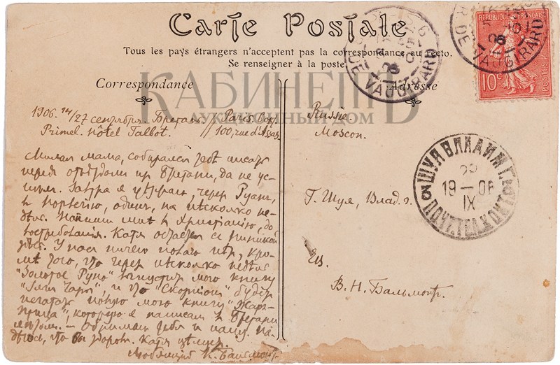 Письмо Константина Бальмонта к матери В.Н. Бальмонт на обратной стороне фотооткрытки. Бретань, 1906.