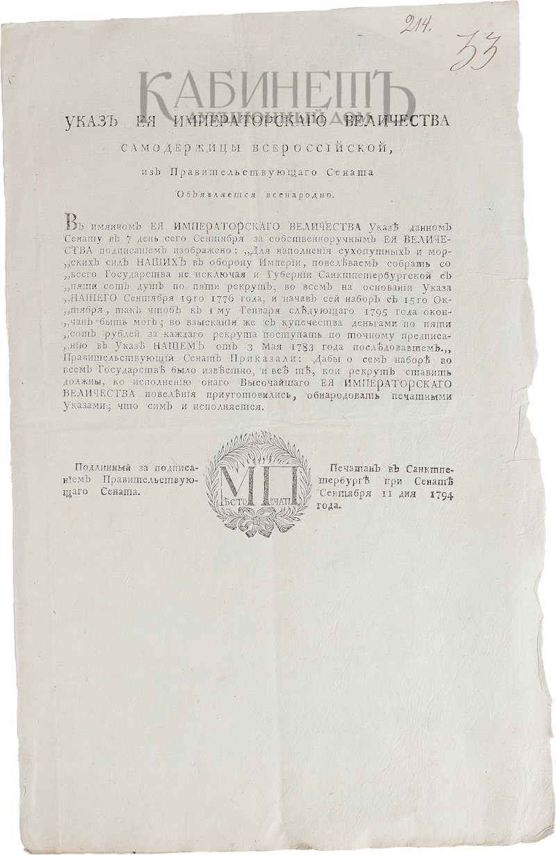 Указ Ее Императорского Величества Самодержицы Всероссийской о рекрутском наборе для наполнения сухопутных и морских сил в оборону Империи. СПб., 1794.