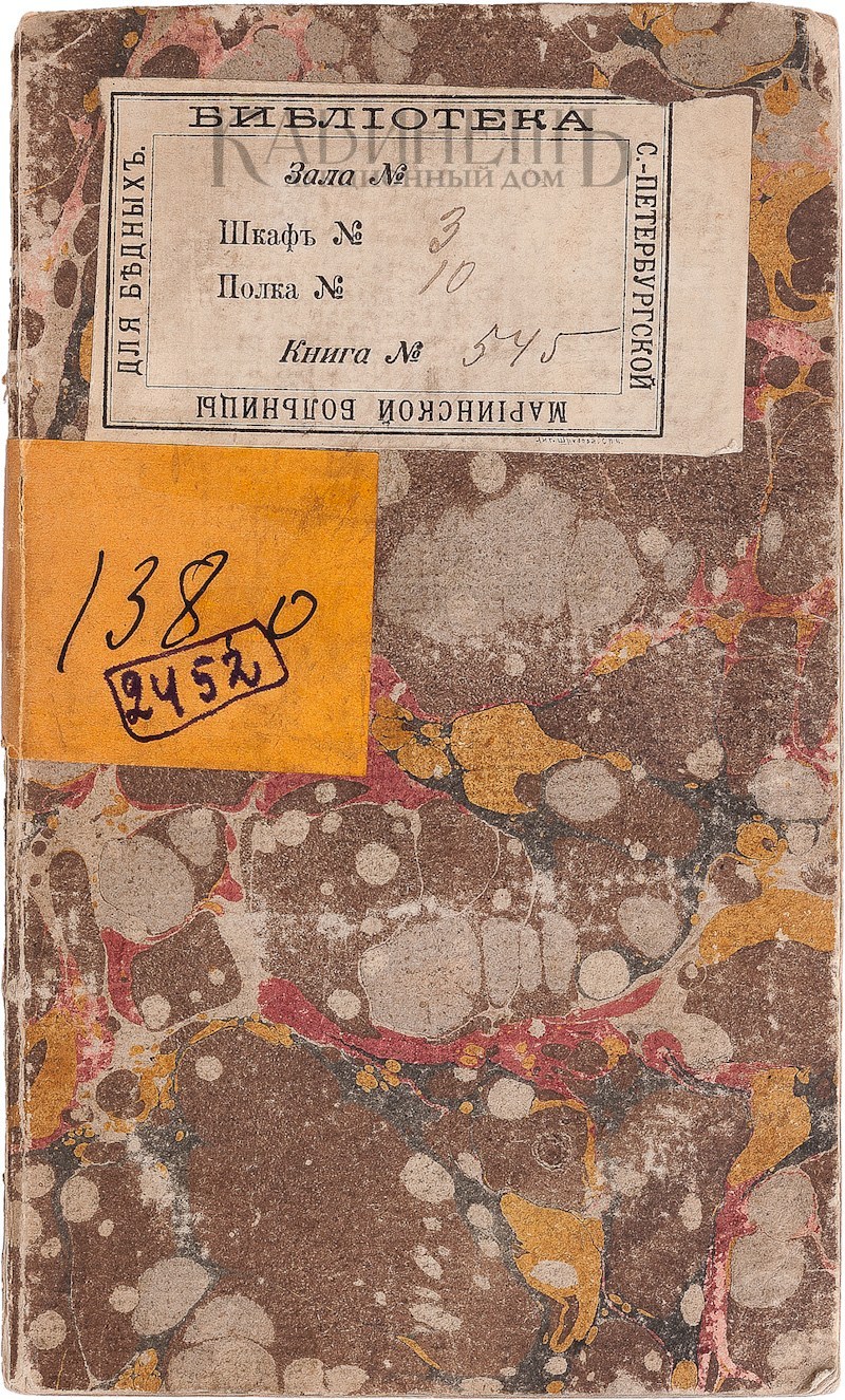 Экземпляр в издательской бумажной обложке, незначительная утрата верхней части задней обложки, на верхней обложке расположен экслибрис: «Библиотека Санкт-Петербургской Мариинской больницы для бедных». На титульном листе владельческие пометки орешковыми и синими чернилами.