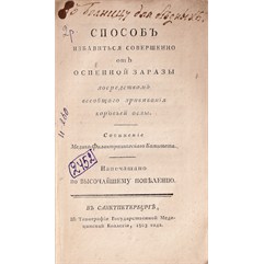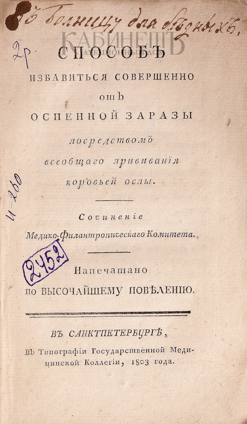 Способ избавляться совершенно от оспенной заразы посредством всеобщего прививания коровьей оспы. Сочинение Медико-Филантропического Комитета. Напечатано по Высочайшему повелению. СПб., в Типографии Государственной Медицинской Коллегии, 1803.