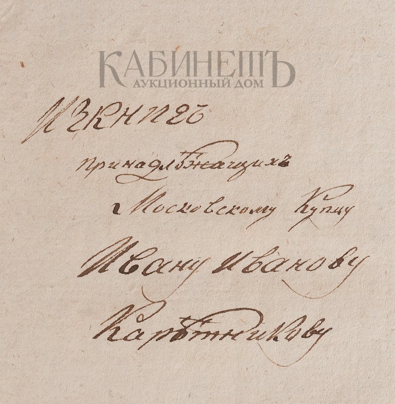 Экземпляр в старинной бумажной обложке, в хорошей сохранности, на форзаце орешковыми чернилами нанесен экслибрис: «Из книг, принадлежащих Московскому Купцу Ивану Ивановичу Каретникову».