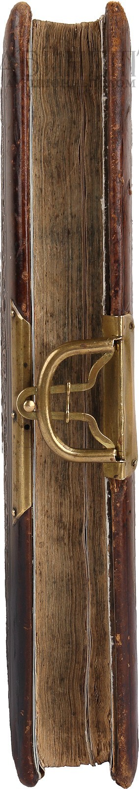 Экземпляр в старинном цельнокожаном переплете конца XIX — начала XX века, с латунной застежкой.